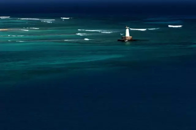▲灯塔如白衣的骑士,屹立在碧波中。
