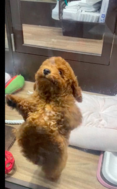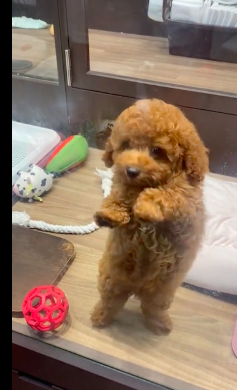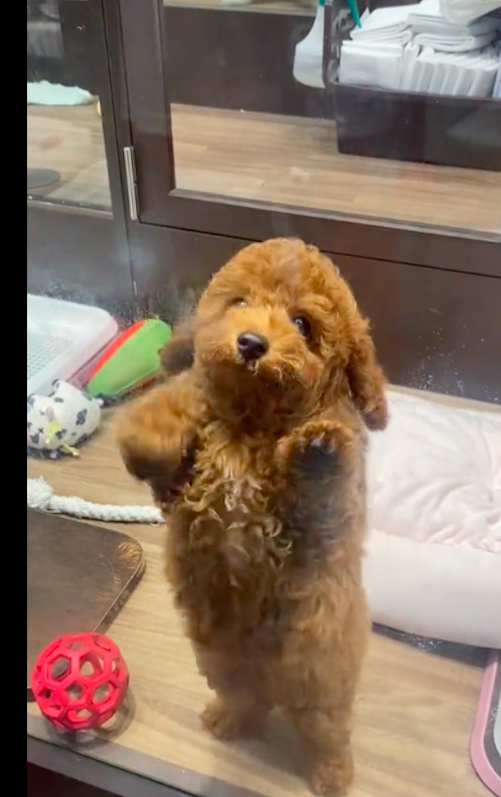 女生去接寄养的小狗,它隔着玻璃跳起肚皮舞,太魔性搞笑了