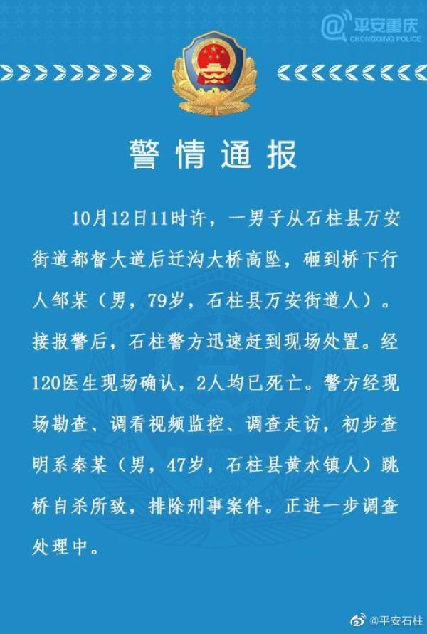10月12日11时许,一男子从石柱县万安街道都督大道后迁沟大桥高坠,砸到桥下行人邹某(男,79岁,石柱县万安街道人)接报警后,石柱警方迅速赶到现场处置。经120医生现场确认,2人均已死亡。警方经现场勘查、调看视频监控、调查走访,初步查明系秦某(男,47岁,石柱县黄水镇人)跳桥自杀所致,排除刑事案件。正进一步调查处理中。