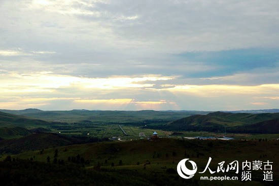 在最高处极目远眺,水草丰茂,满目苍翠。一望无际的草原连着起伏的丘陵向远方延伸,哈拉哈河在夕阳里被染上金色的霞光。