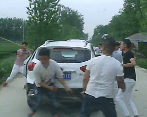 在小路上,团伙成员前后夹击他人车辆,10多人将被害人车辆团团围住,用长木棍打砸车辆,逼迫被害人下车,并对其进行殴打。