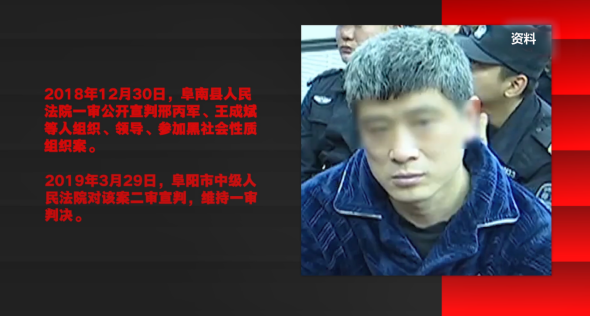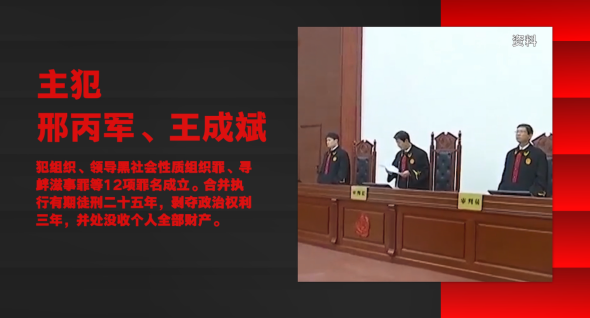 同年12月,阜南县人民法院一审公开宣判,主犯邢丙军、王成斌犯组织、领导黑社会性质组织罪、寻衅滋事罪等12项罪名成立,合并执行有期徒刑二十五年,剥夺政治权利三年,并处没收个人全部财产。其余50名被告人分别获刑。