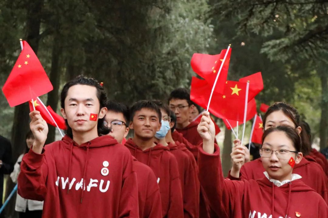 西北农林科技大学的同学们挥舞着红旗,他们心中有光。葛舒悦摄