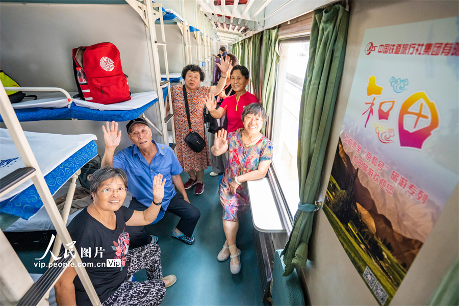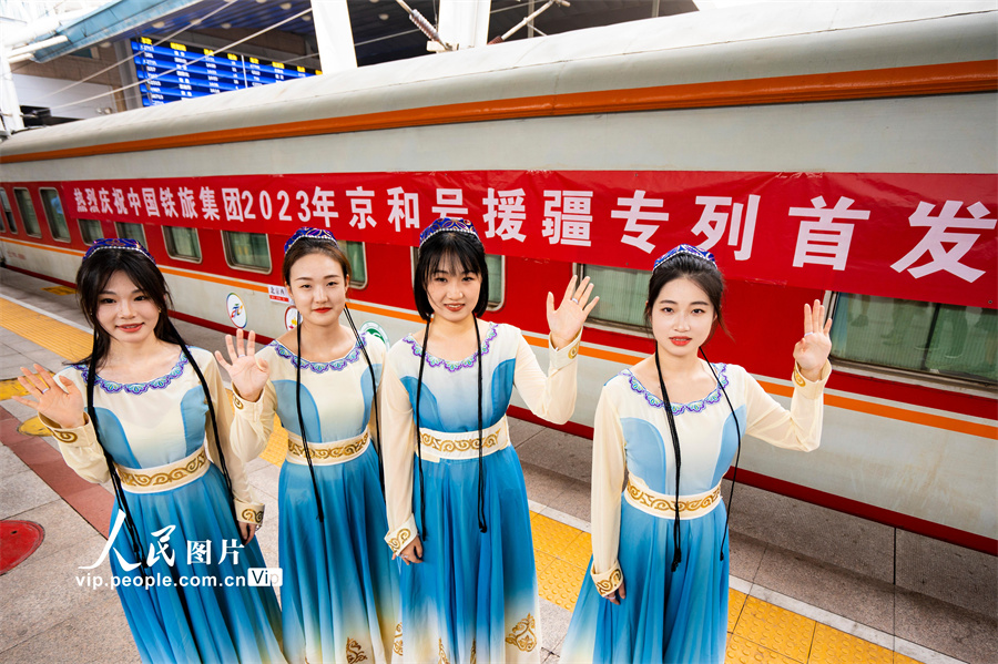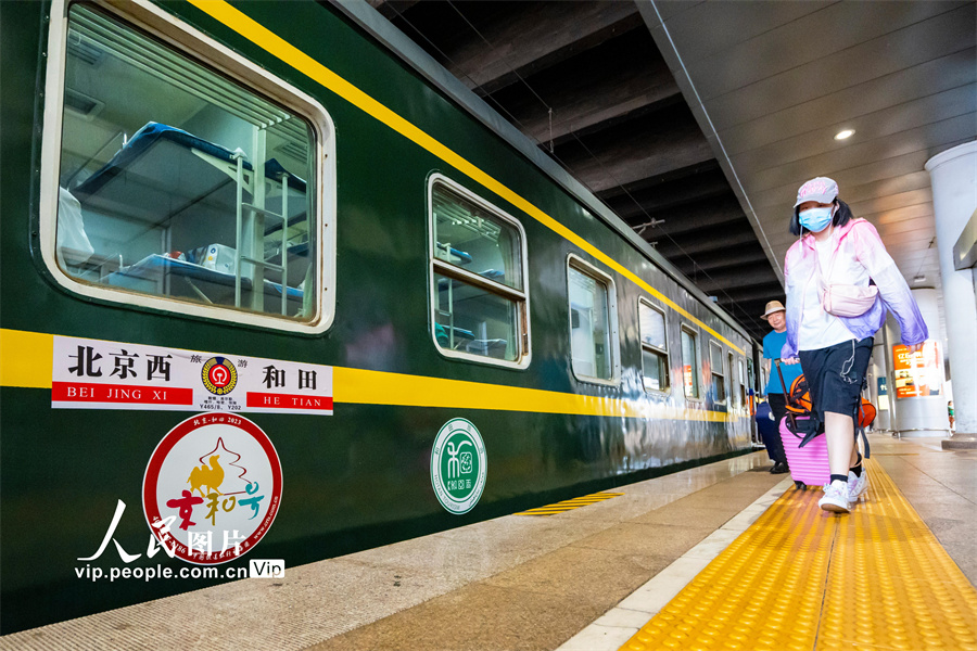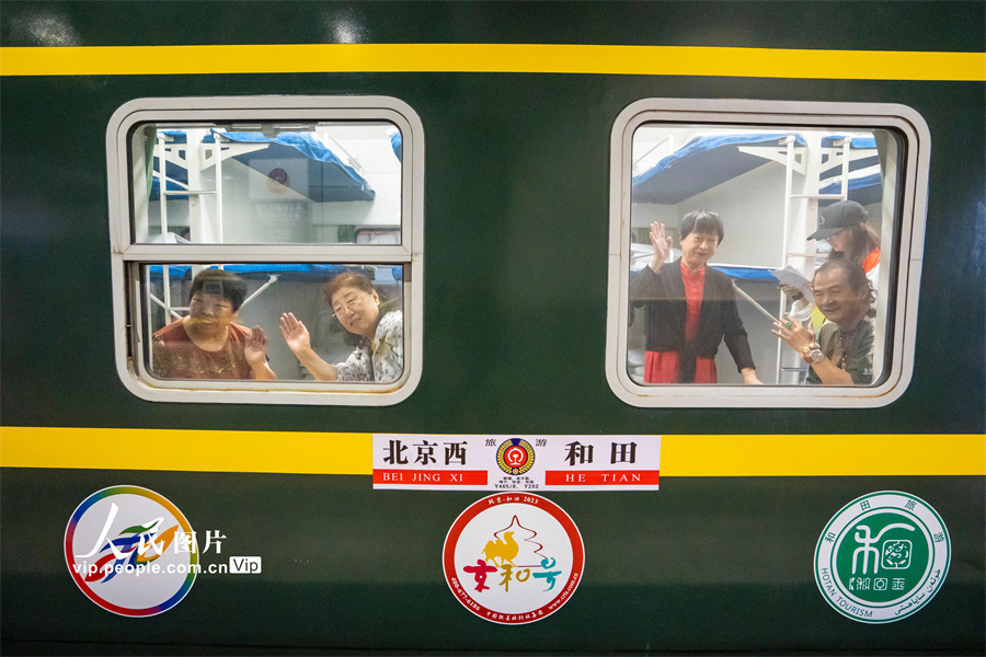 2023年7月24日14:32分,Y465次“京和号”旅游专列载着420名游客准时从北京西站出发,这是中国铁道旅行社集团有限公司2023年首趟开往新疆的旅游专列。本趟“京和号”旅游专列全程共计16天,行程涵盖和田、喀什、库尔勒、哈密、敦煌、张掖等地,游客们将游览敦煌莫高窟、鸣沙山、七彩丹霞、博斯腾湖、艾提尕尔清真寺、罗布人村寨等国家级自然人文景区。孙立君摄(人民图片网)