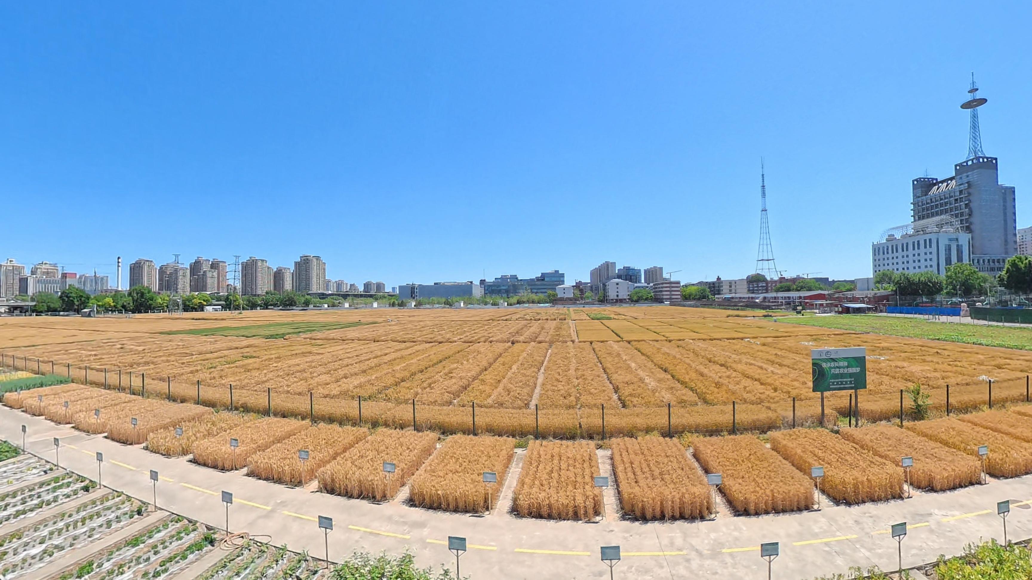 人民网北京6月5日电 (记者王天乐、李栋)芒种时节,位于北京市三环内隶属于中国农业科学院作物科学研究所的试验田里,麦浪滚滚,满眼金黄。这片被网友誉为北京“最贵麦田”的地块上,金灿灿的麦浪与都市湛蓝的天际线交相辉映,构成了一道独特的城市田园景观。北京三环内金黄的麦田与湛蓝的天空构成一幅独特的城市田园图。人民网记者 王天乐摄