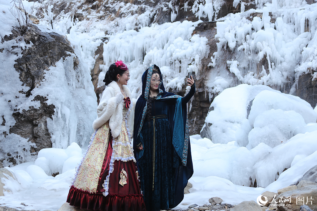 2026年1月22日,在河南焦作云台山景区,冰瀑景观吸引游客前来观赏留影,宛如步入童话世界。人民网记者 霍亚平摄