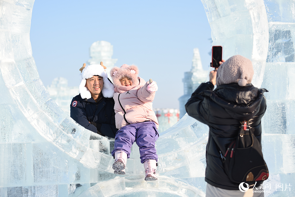 一家三口在哈尔滨冰雪大世界内打卡拍照。人民网记者 徐成龙摄