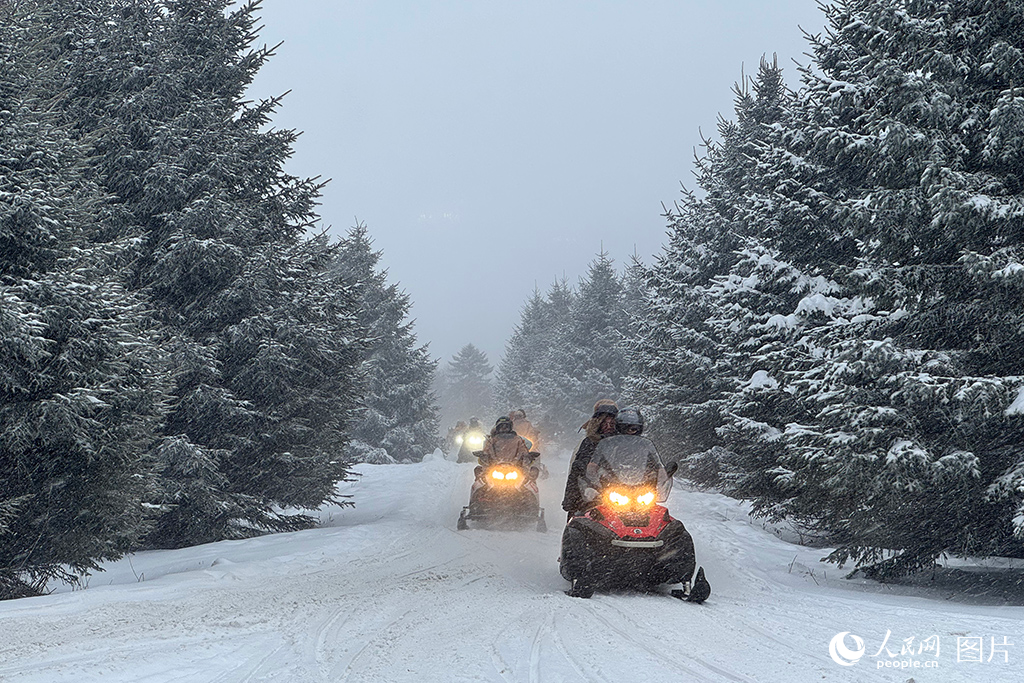 2025年12月23日,在吉林延边安图县雪岭景区,游客乘坐雪地摩托驰骋在林海雪原。人民网记者 李思玥摄