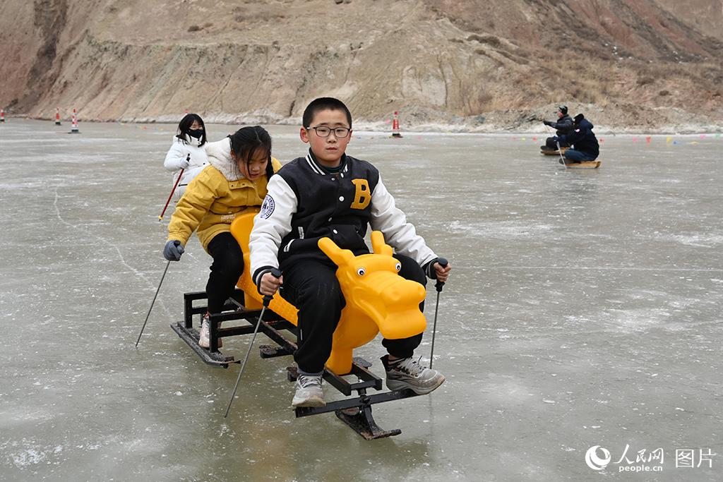 2026年1月25日,两位小朋友在甘肃兰州水居丹霞滑冰场滑冰。人民网 席娟娟摄