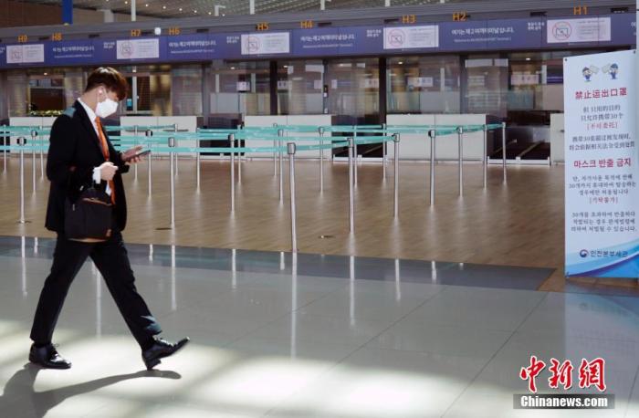 资料图:3月20日,韩国仁川国际机场,工作人员走过机场大厅。中新社记者 曾鼐 摄
