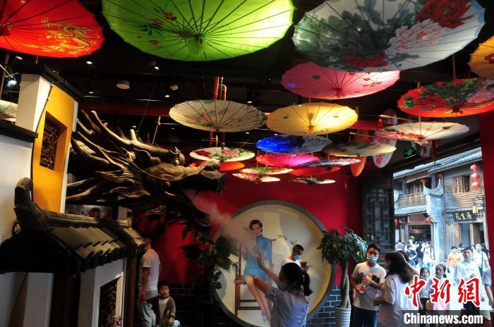图为穿着古装和卡通服的民众在福州三坊七巷游玩。 张斌 摄