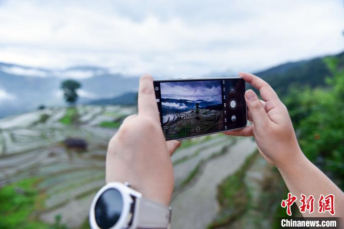 6月4日,游客在龙胜各族自治县泗水乡泗水村小岩底屯拍摄梯田风光。 吴生斌 摄