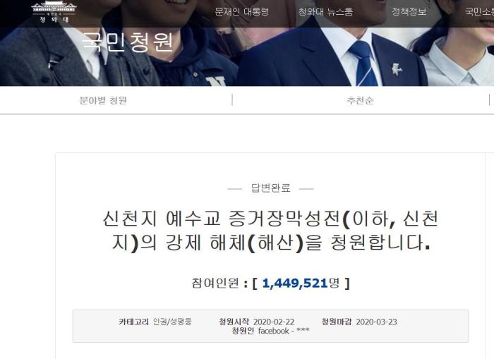 韩国民众在青瓦台请愿网站发帖请求强制解散“新天地”教会。图片来源:韩国青瓦台请愿网站截图。