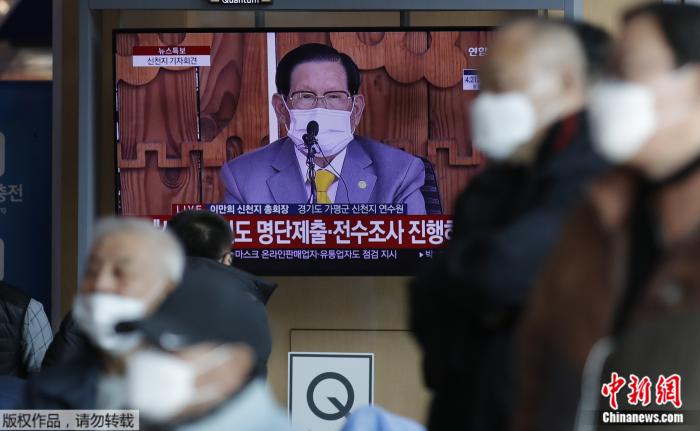 2020年3月2日,人们在韩国首尔火车站观看有关“新天地”教会总会长李万熙的直播报道。