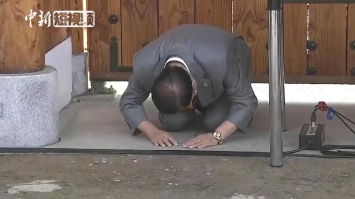 2020年3月2日下午,韩国“新天地”教会会长李万熙跪地道歉。图片来源:中新视频截图