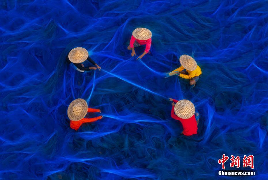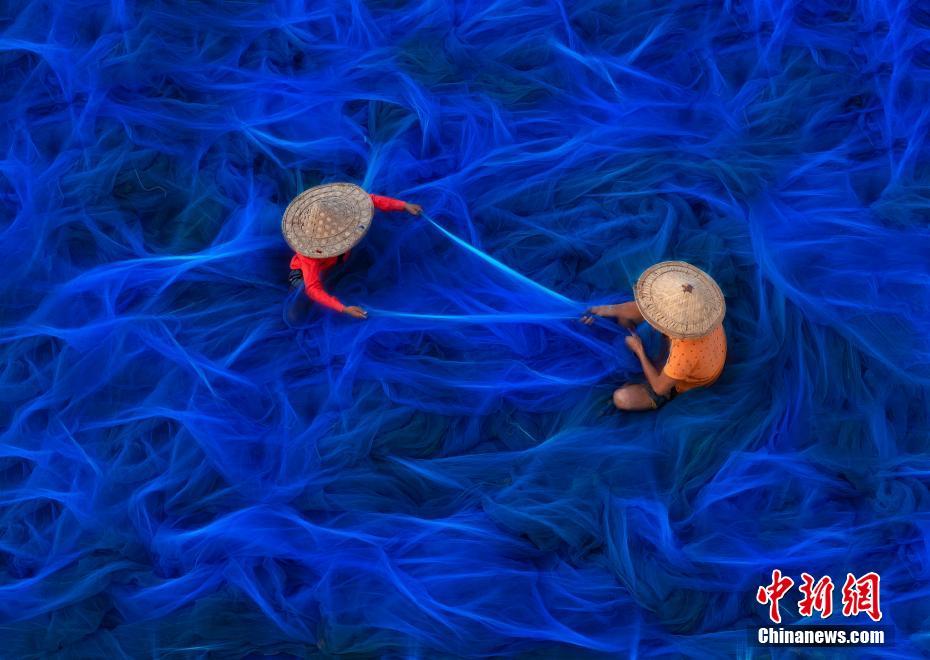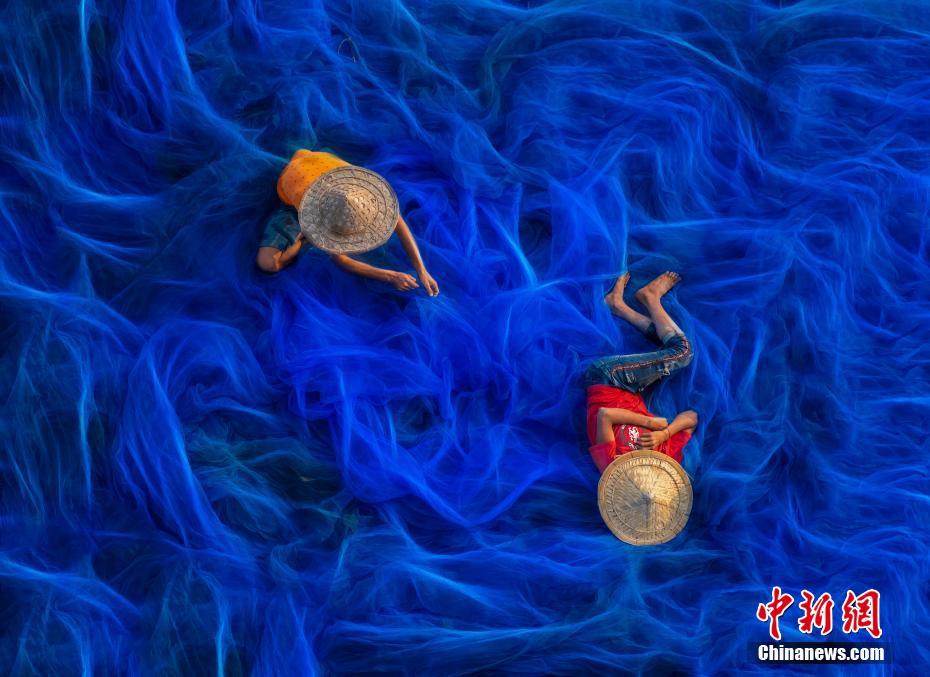 4月22日讯,印度孟加拉邦孙德尔本斯,渔民坐在亮蓝色的渔网上,穿针引线进行渔网修补工作,好似置身深邃海洋。图片来源:视觉中国