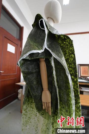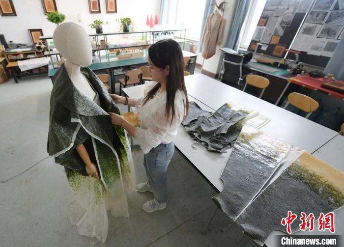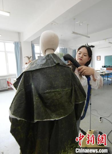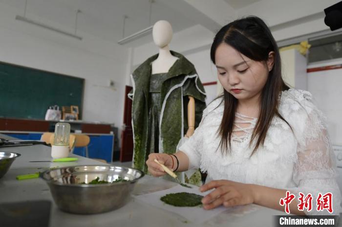 唐丹阳自创可食用服装的细节展示 张瑶 摄 5月28日,在长春人文学院,唐丹阳在整理她自创的可食用服装。唐丹阳是这所学校大四学生,她经过多次试验,利用从菠菜中提取的纤维代替传统纤维,通过与糖浆等可食用物质混合,制成可折叠、熨烫、缝纫,也可以吃的服装。唐丹阳说,这件作品拥有环保可降解的特性,可以将不新鲜的蔬菜瓜果进行二次利用,环保安全。