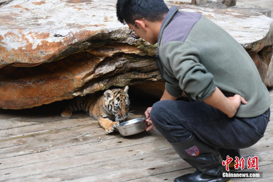 7月29日,云南昆明,云南野生动物园的饲养员给小东北虎喂食。近日,该动物园的东北虎双胞胎、小梅花鹿和小鸵鸟顺利度过适应期,在暑期正式与游客见面。 中新社记者 刘冉阳 摄