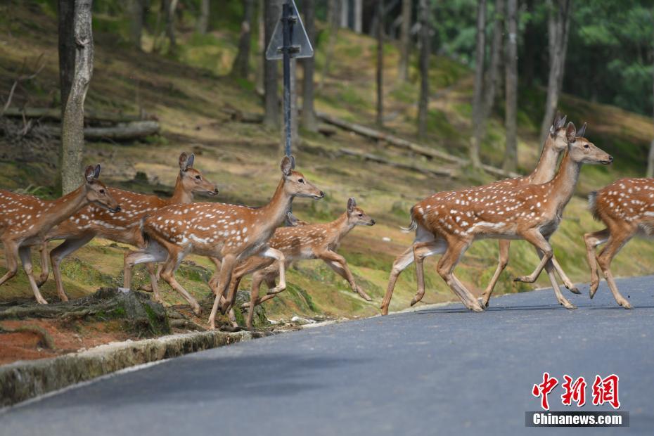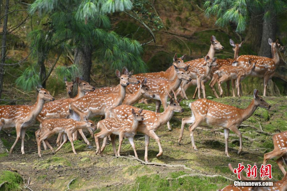 7月29日,云南昆明,云南野生动物园的小梅花鹿和鹿群一起活动。近日,该动物园的东北虎双胞胎、小梅花鹿和小鸵鸟顺利度过适应期,在暑期正式与游客见面。 中新社记者 刘冉阳 摄