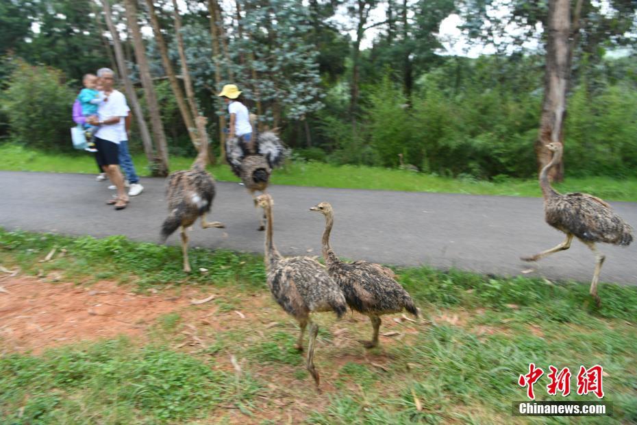7月29日,云南昆明,云南野生动物园的小鸵鸟在户外活动。近日,该动物园的东北虎双胞胎、小梅花鹿和小鸵鸟顺利度过适应期,在暑期正式与游客见面。 中新社记者 刘冉阳 摄