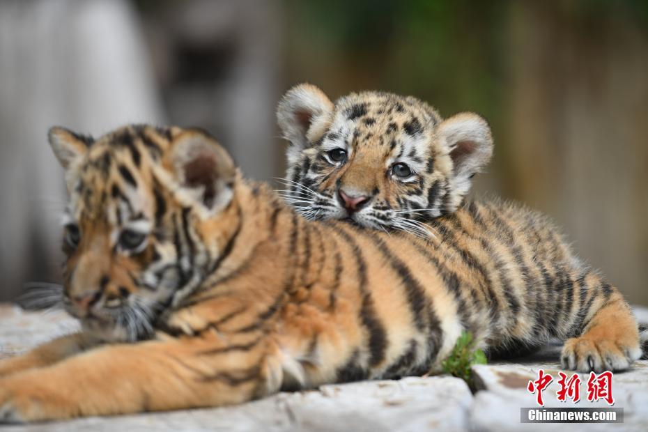 7月29日,云南昆明,云南野生动物园的小东北虎依偎在一起。近日,该动物园的东北虎双胞胎、小梅花鹿和小鸵鸟顺利度过适应期,在暑期正式与游客见面。 中新社记者 刘冉阳 摄