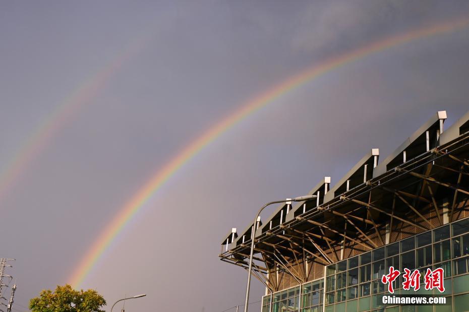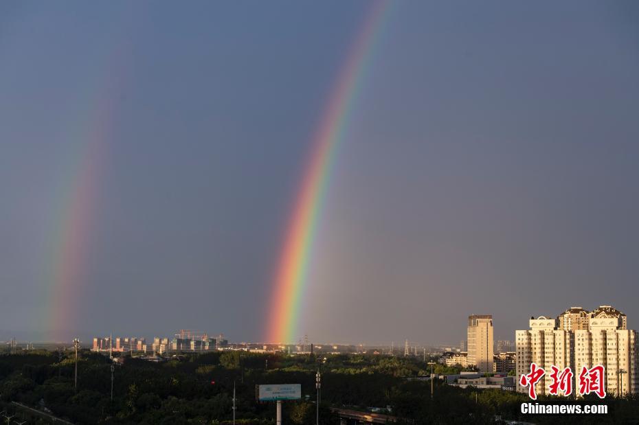 8月26日傍晚,北京城区部分地区降雨,天空中出现双彩虹。 中新社记者 崔楠 摄