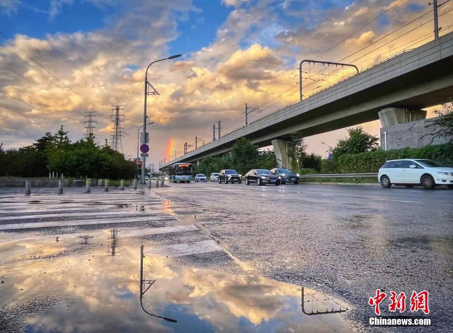 8月26日傍晚,北京雨霁,霓虹挂天穹。 中新社记者 侯宇 摄