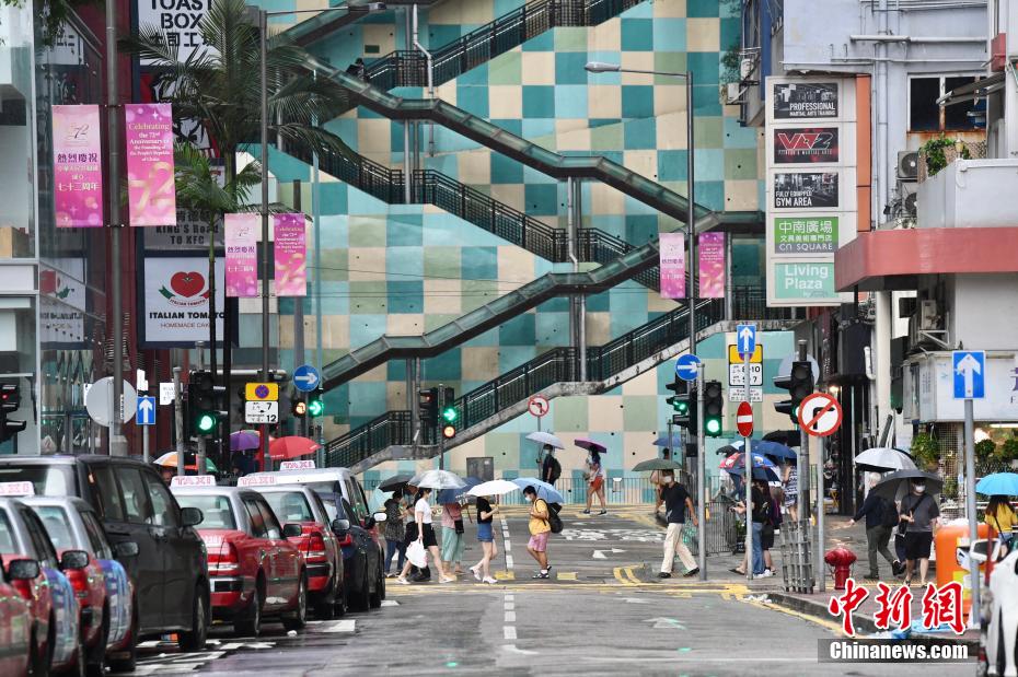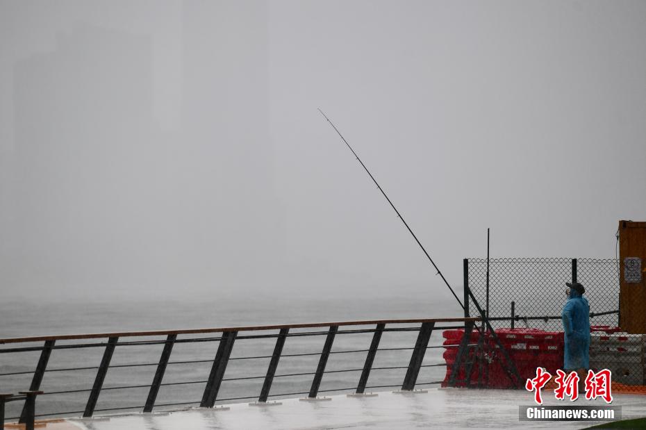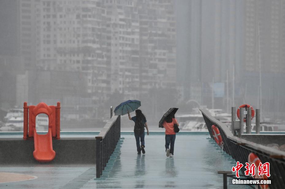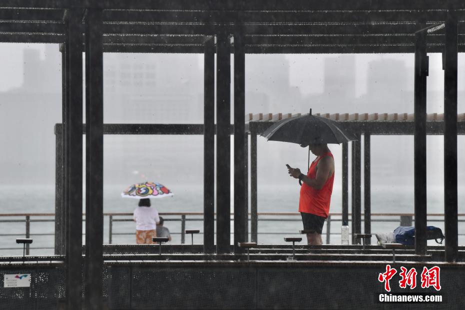 香港天文台9日清晨6时40分发出八号风球。香港近海区域明显感受到热带风暴“狮子山”的威力。有市民到炮台山东岸公园主题区消遣,维港海面朦胧一片。海怡半岛海滨有数米高的海浪拍打岸边。受热带风暴影响,大量渔船停泊在香港仔避风塘避风。图为市民于炮台山东岸公园主题区消遣。 李志华 摄