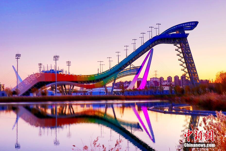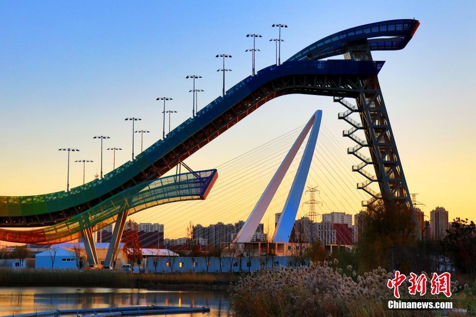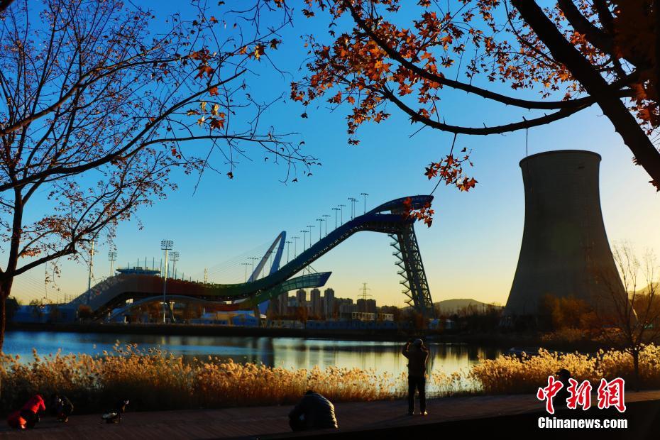 2021年11月12日,北京冬奥公园傍晚景色。北京冬奥公园紧邻首钢园区,滑雪大跳台与首钢大桥交相辉映。 中新社发 牛云岗 摄 图片来源:CNSPHOTO