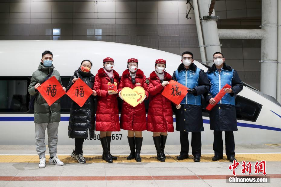1月17日凌晨,北京地区第一趟始发列车——G6737次列车停靠在北京西站,乘务员、车站志愿者和乘客在站台合影。当日,2022年春运大幕正式开启。今年春运从1月17日至2月25日,共40天。 中新社记者 贾天勇 摄