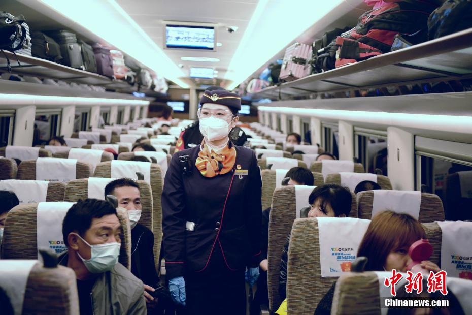 1月17日,2022年春运大幕开启,在深圳北站开往合肥南站的G636次高铁列车上,深圳铁路公安处乘警支队乘警与列车长格外繁忙,帮助困难旅客乘车,时刻提醒乘客做好安全防疫,一路守护旅客的安全。图为列车长在巡视车厢。 中新社记者 陈文 摄