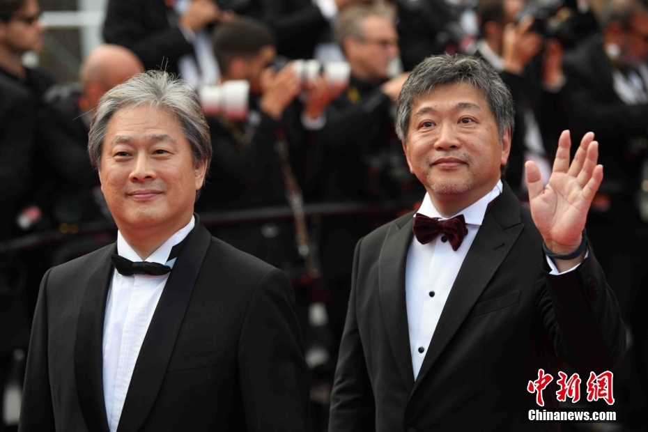 当地时间5月24日晚,导演朴赞郁(左)与导演是枝裕和亮相戛纳电影节75周年庆典之夜红毯。 中新社记者 李洋 摄