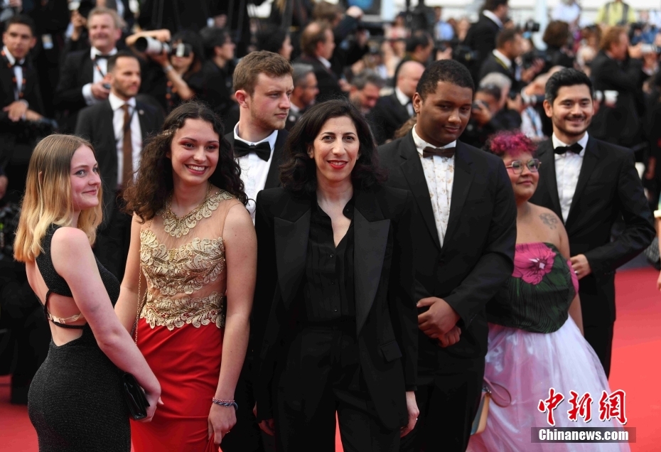 当地时间5月24日晚,法国新任文化部长马拉克(前排左三)亮相戛纳电影节75周年庆典之夜红毯。 中新社记者 李洋 摄