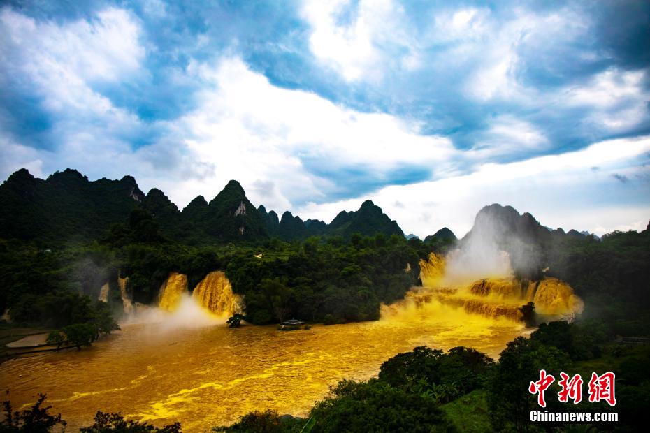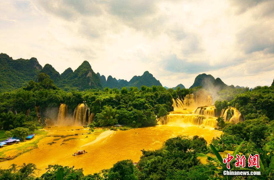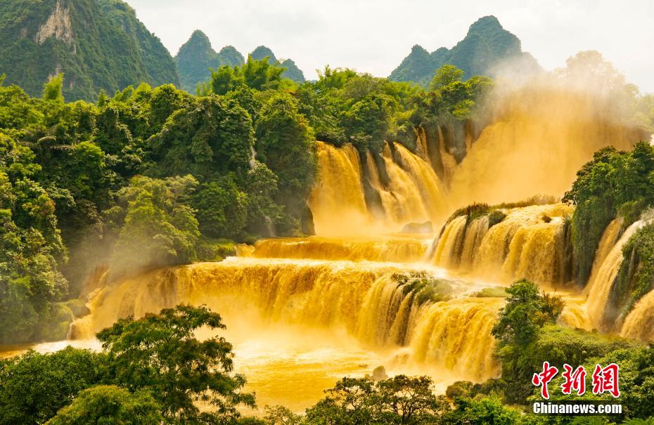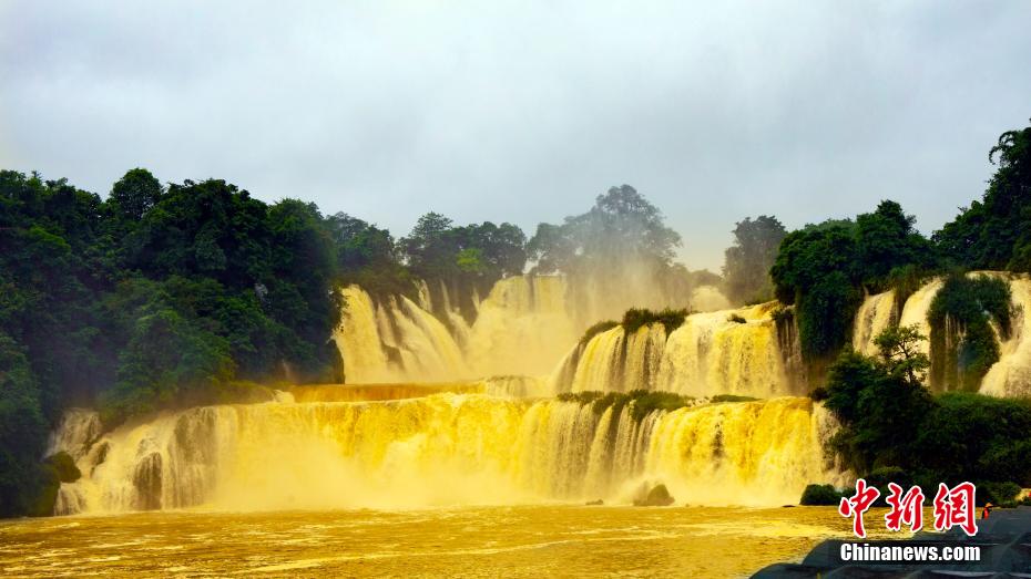 5月26日,位于广西崇左市大新县境内的德天跨国瀑布景区惊现“黄金瀑布”壮观景象。连日来,受到雨季汛期的影响,德天跨国瀑布景区迎来今年丰水期的第一次汛期,瀑布一改往日清澈之势,水流量明显增加,伴随急流冲刷河床带着泥沙流的瀑布咆哮而来,在阳光的照射下呈现金黄色,形成蔚为壮观的“黄金瀑布”奇观。德天瀑布位于中国与越南边境处的归春河上游,与紧邻的越南板约瀑布相连,是亚洲第一、世界第四大跨国瀑布。杨虎旺 摄