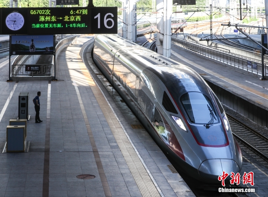 7月18日,G6702次列车抵达北京西站。当日起,针对涿州地区早高峰进京通勤人员需求,涿州东--北京西间加开1对“京涿通勤高铁”,首班始发车G6702次,涿州东6:23开,北京西6:47到,运行24分钟。末班终到车G6743次:北京西22:00开,涿州东22:25到,运行25分钟。 中新社记者 贾天勇 摄