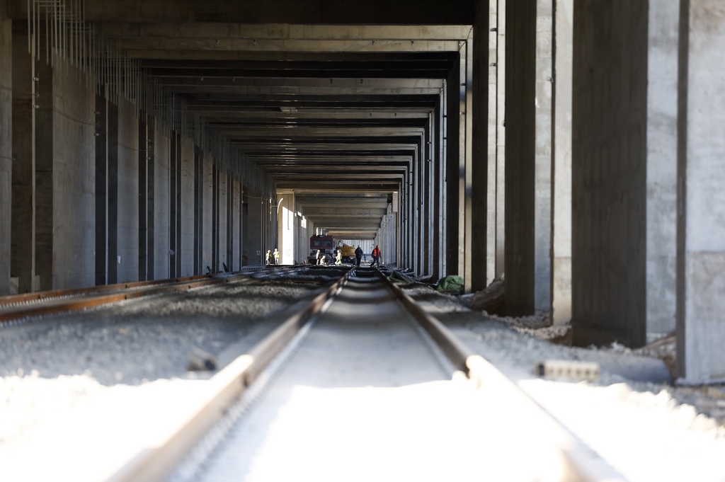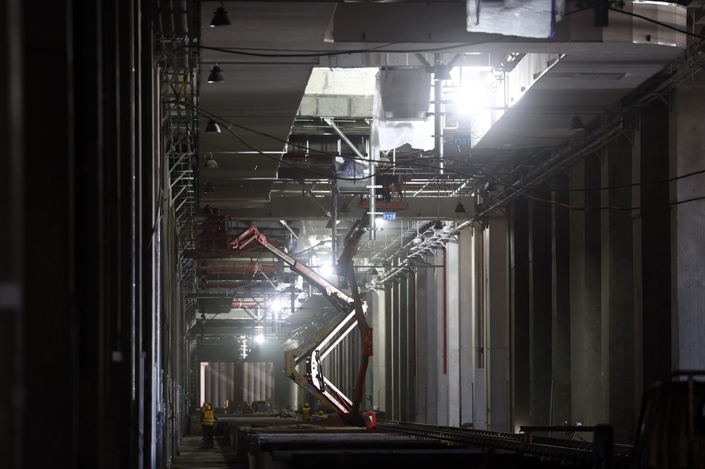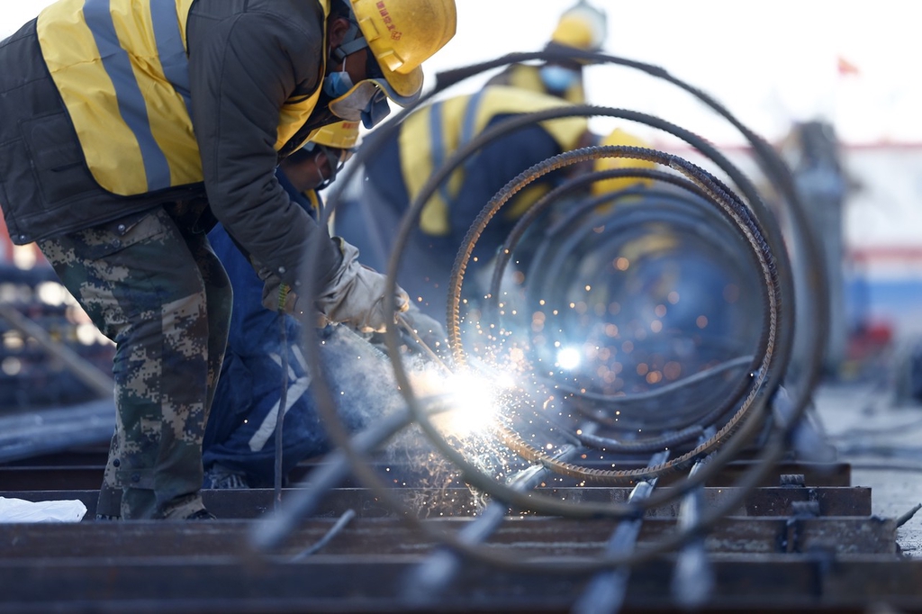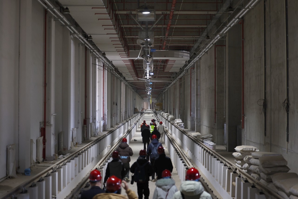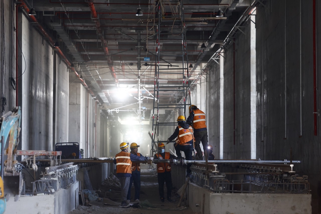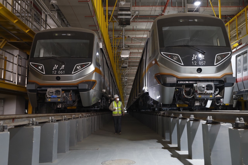 2023年2月20日,施工人员在北京地铁12号线东坝车辆段施工。北京地铁12号线正线全长为29.6km,西起西四环四季青桥南,东至东坝北街,途经海淀、西城、东城、朝阳四个行政区,全线共设21座车站,其中换乘站15座,全线建成通车后,将与4号线、5号线、8号线等12条线路实现换乘。当前12号线车辆陆续进场,工程正在加速推进。 中新社记者 富田 摄
