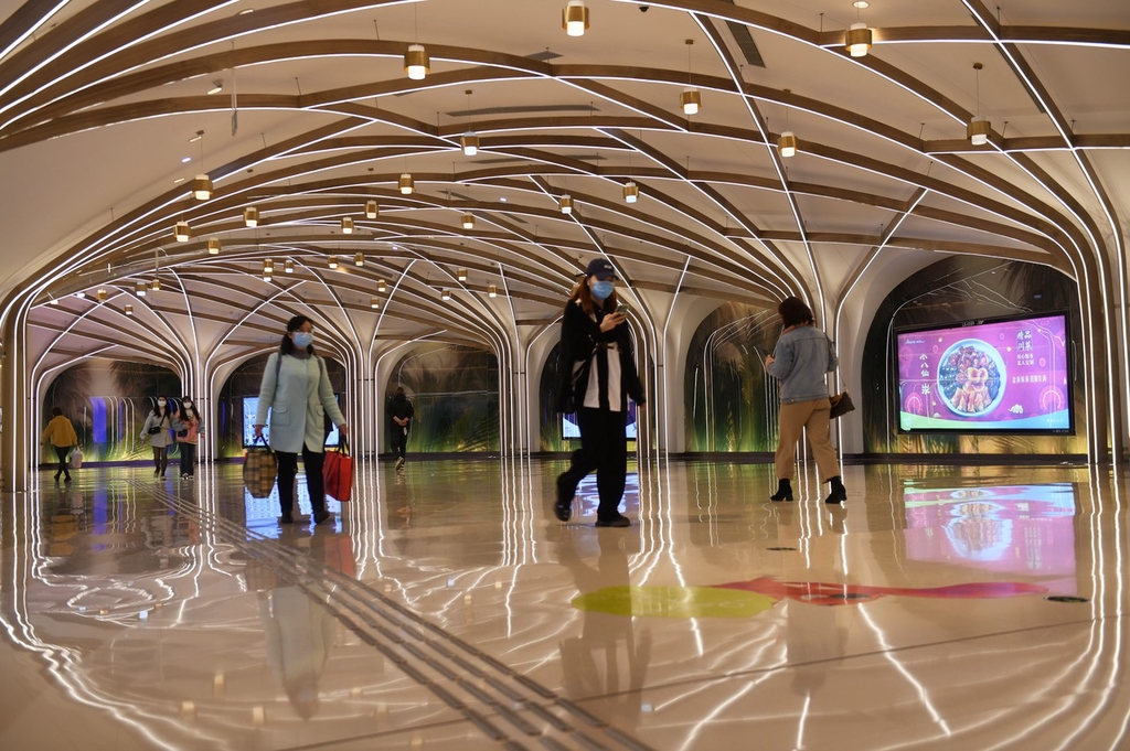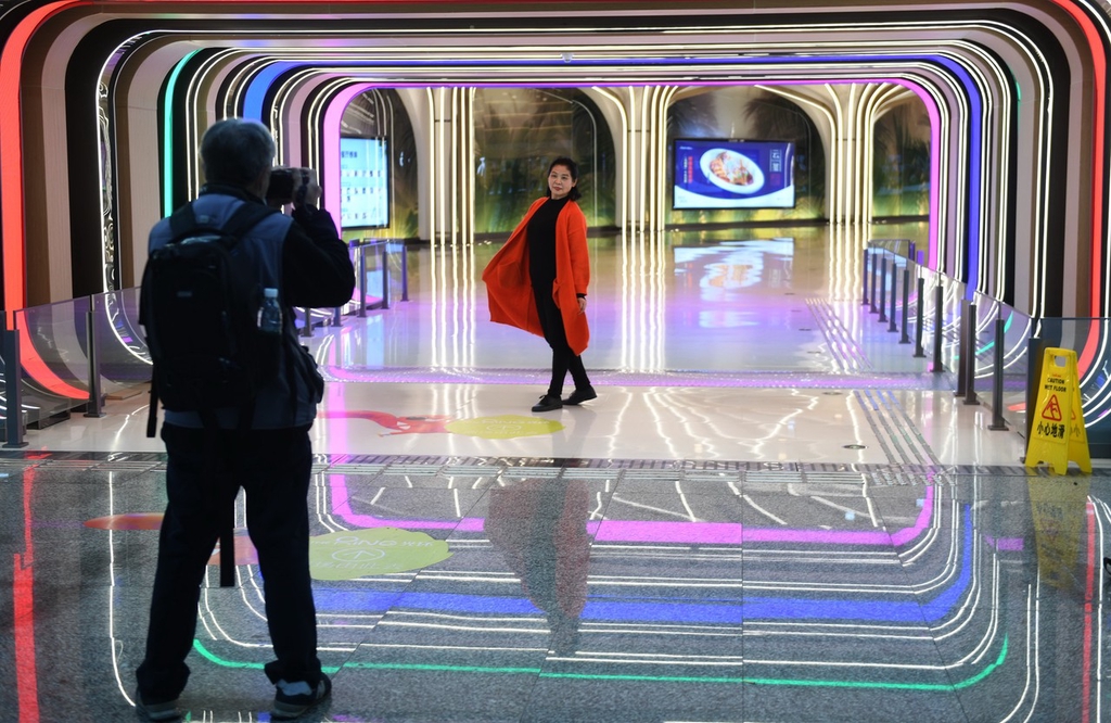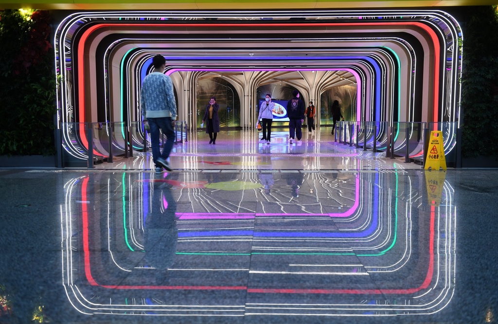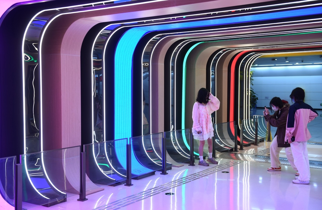 2023年3月13日,市民在重庆地铁5号线重光站拍照打卡。该地铁站内布置的灯光装饰犹如时空隧道,科技感十足,市民行走于此仿佛置身未来光影空间。 中新社记者 周毅 摄