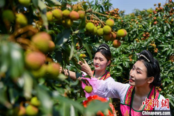 图为海南省海口市三门坡镇荔海共享农庄,身着古装的女子采摘荔枝。 骆云飞 摄