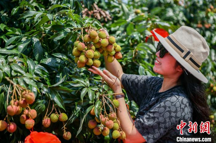 图为海南省海口市三门坡镇荔海共享农庄,游客采摘荔枝。 骆云飞 摄