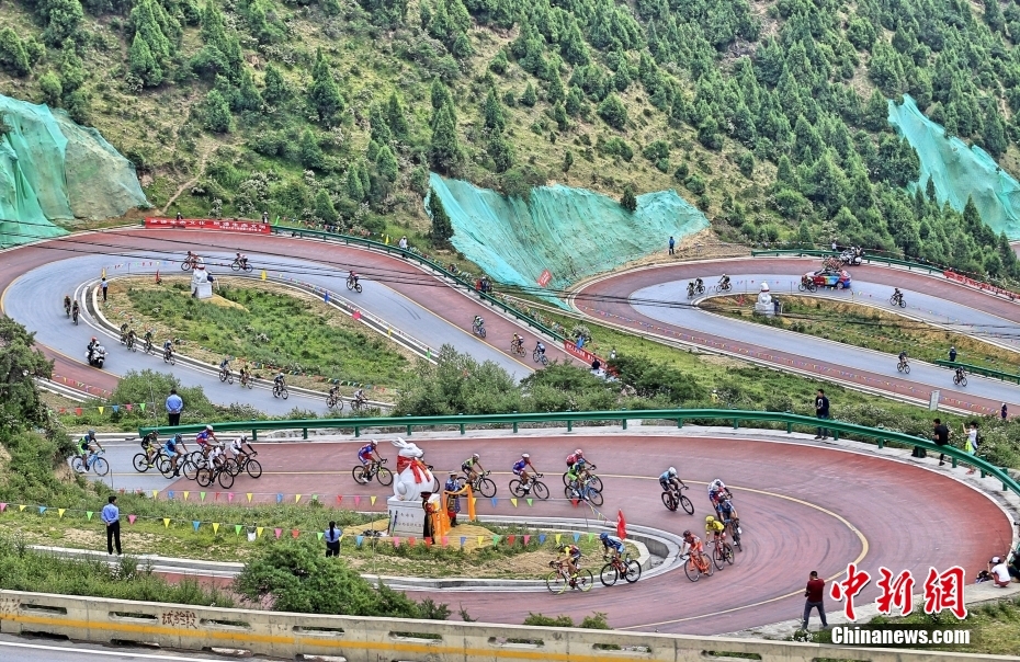 2017年7月23日,第十六届环青海湖国际公路自行车赛,车手正在翻越十二盘赛道。中新社记者 胡贵龙 摄
