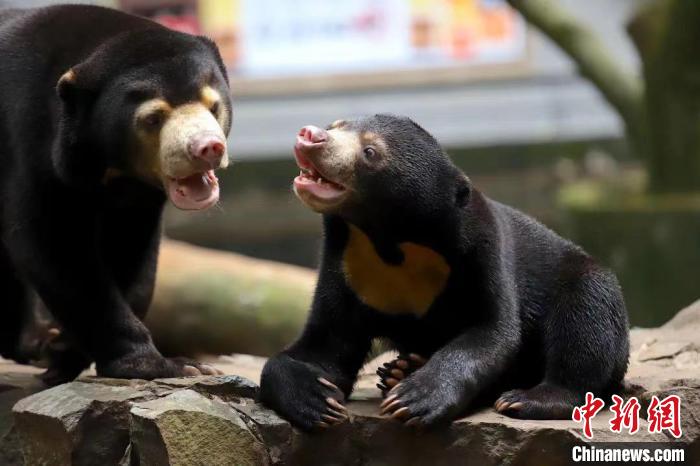 8月4日,杭州动物园内两只马来熊在园内休息互动。 (资料图)