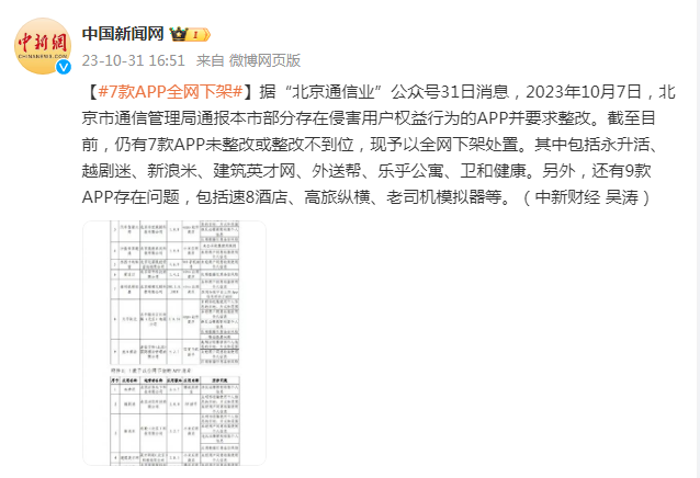 据“北京通信业”公众号31日消息,2023年10月7日,北京市通信管理局通报本市部分存在侵害用户权益行为的APP并要求整改。截至目前,仍有7款APP未整改或整改不到位,现予以全网下架处置。其中包括永升活、越剧迷、新浪米、建筑英才网、外送帮、乐乎公寓、卫和健康。另外,还有9款APP存在问题,包括速8酒店、高旅纵横、老司机模拟器等。