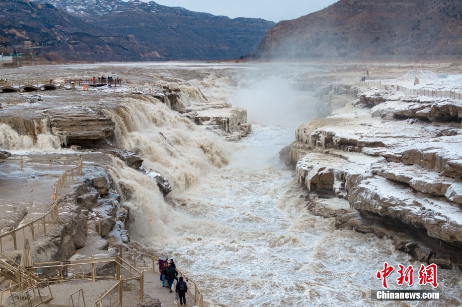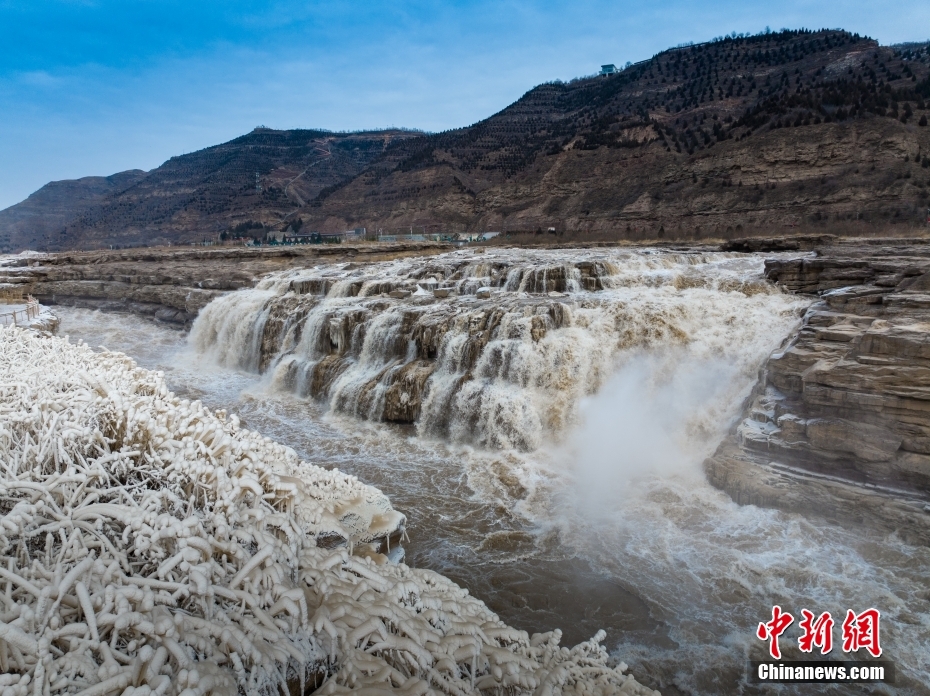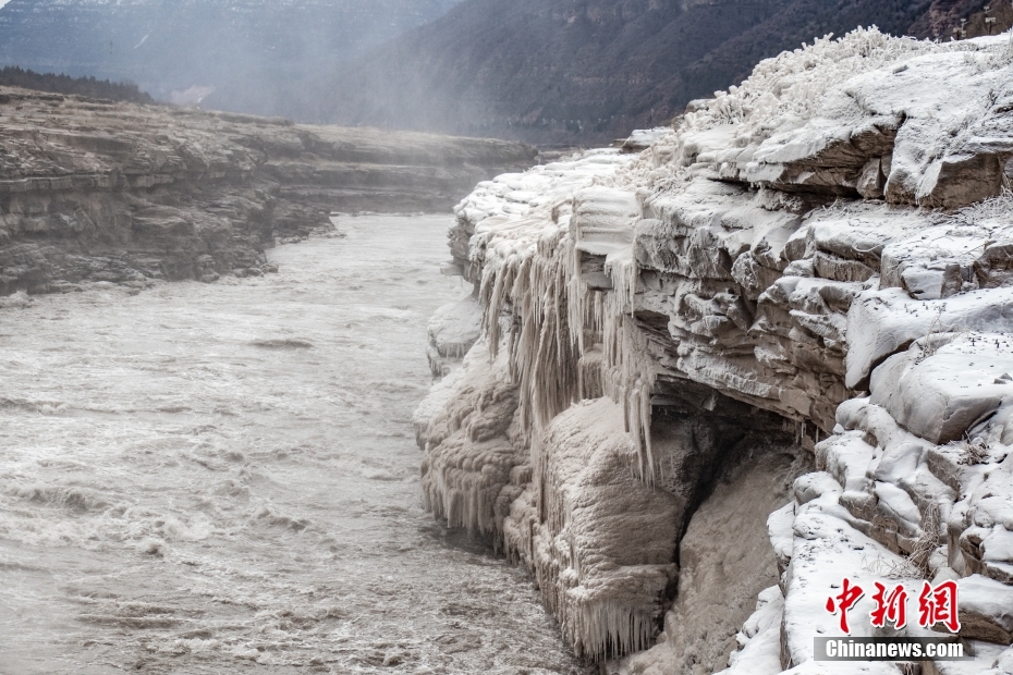 12月17日,陕西延安,位于秦晋峡谷中段的黄河壶口瀑布出现冬季流凌景观。中新社发 宋洋波 摄