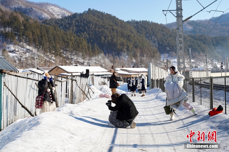 2月4日,黑龙江海林,横道河子铁道口吸引游客“打卡”拍照。