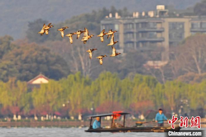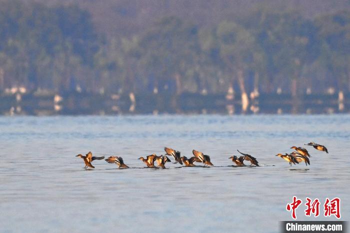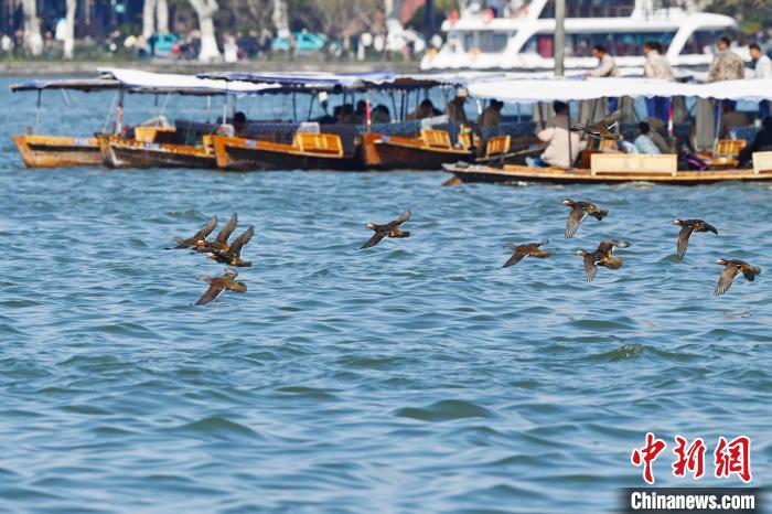 3月17日,浙江杭州,一群鸳鸯在西湖手划船码头前飞翔。陆建利 摄