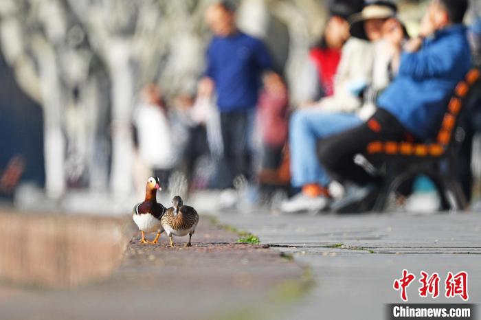 3月22日,浙江杭州,一对鸳鸯在西湖边“散步”。陆建利 摄