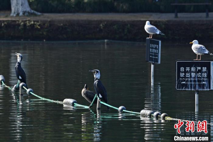 3月23日,浙江杭州,鸬鹚及织女银鸥在竹桩上小憩。陆建利 摄