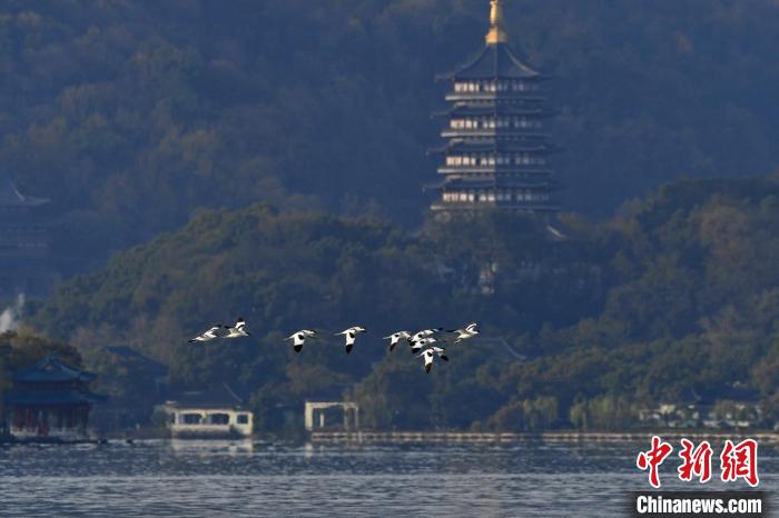 3月17日,浙江杭州,一拨反嘴鹬在西湖雷峰塔前掠过。陆建利 摄