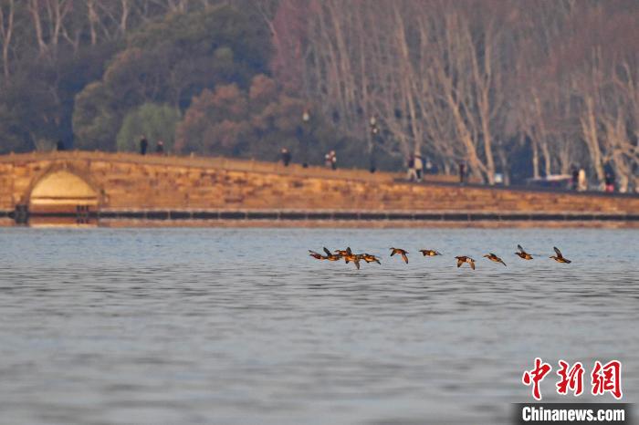 3月24日,浙江杭州,10余只白眉鸭过境西湖。陆建利 摄