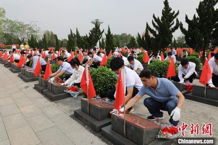 在志愿服务环节,“90后”青年干部赖迪俯身擦拭墓碑,凝视着上面的名字和照片,低声呢喃:“谢谢你们……”